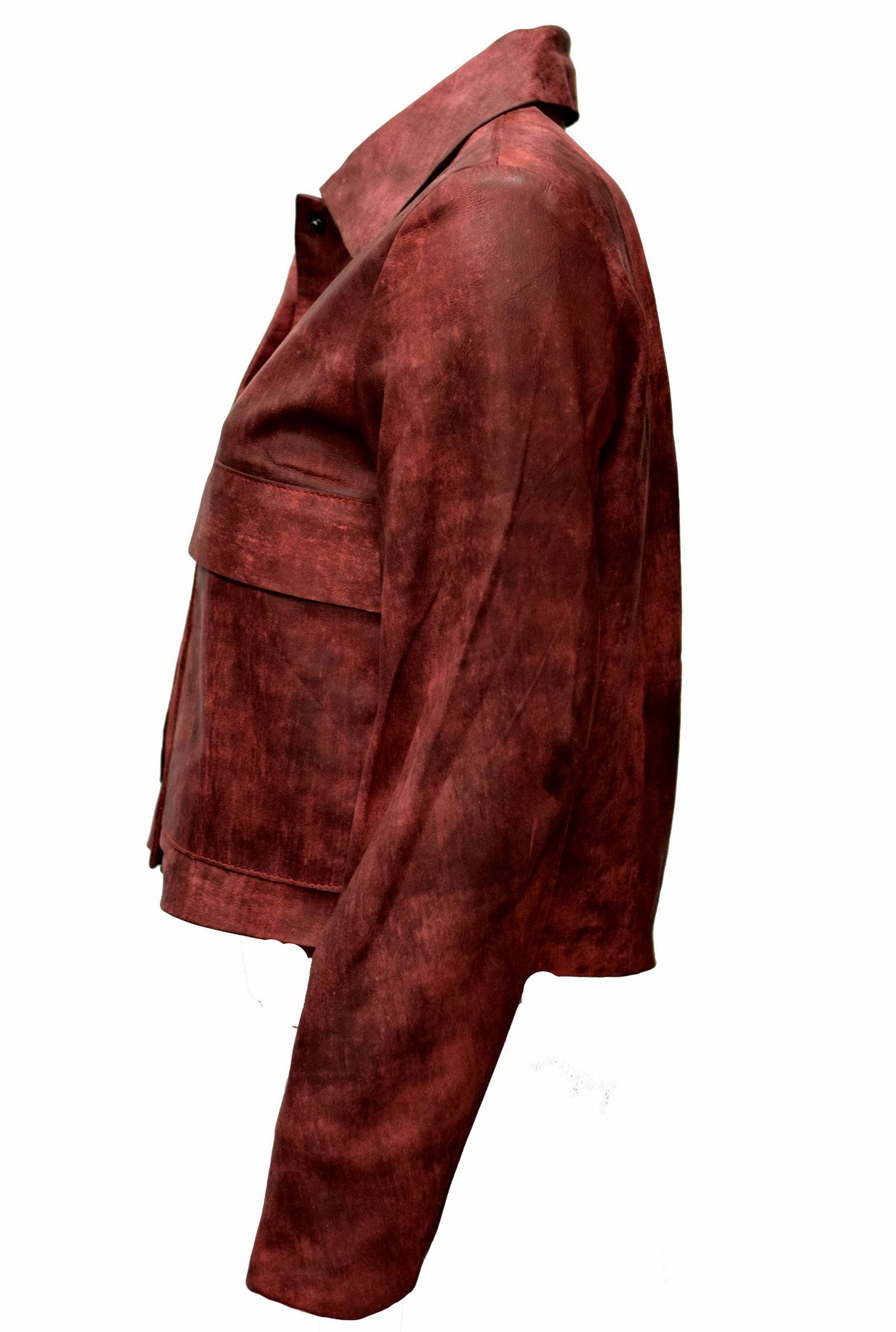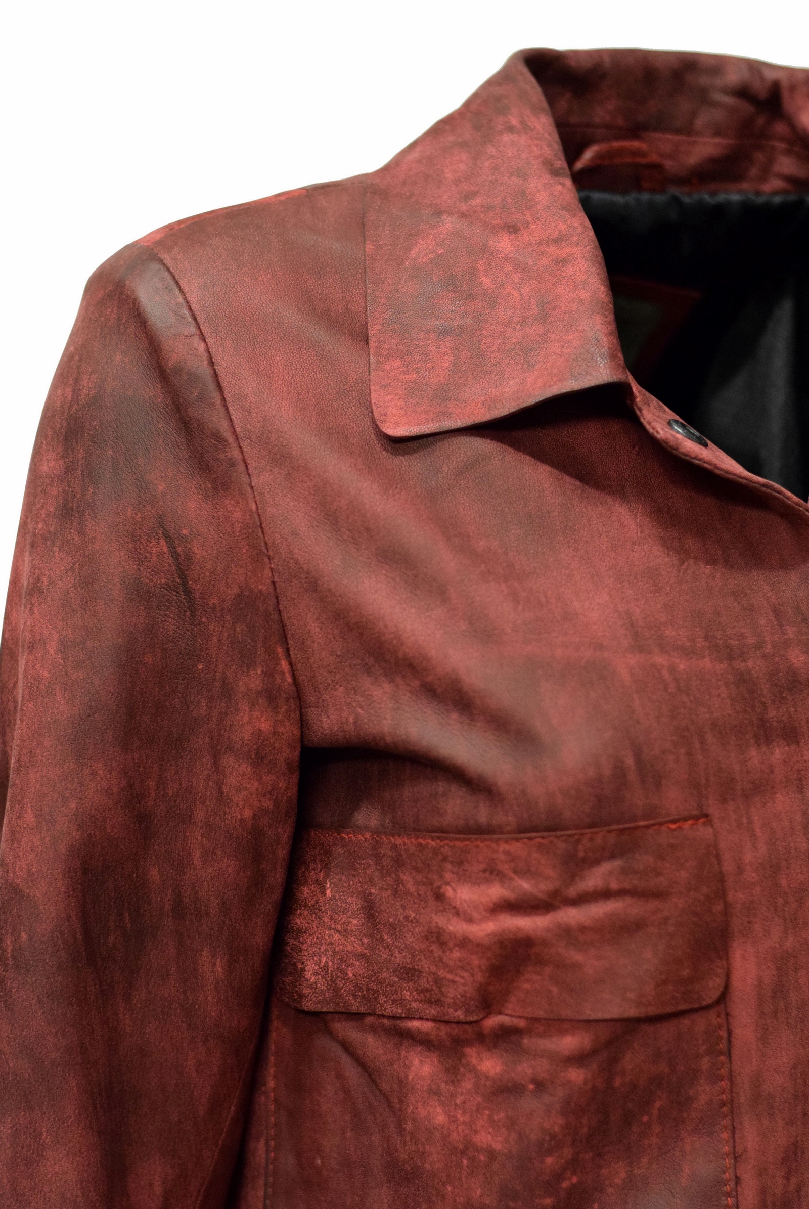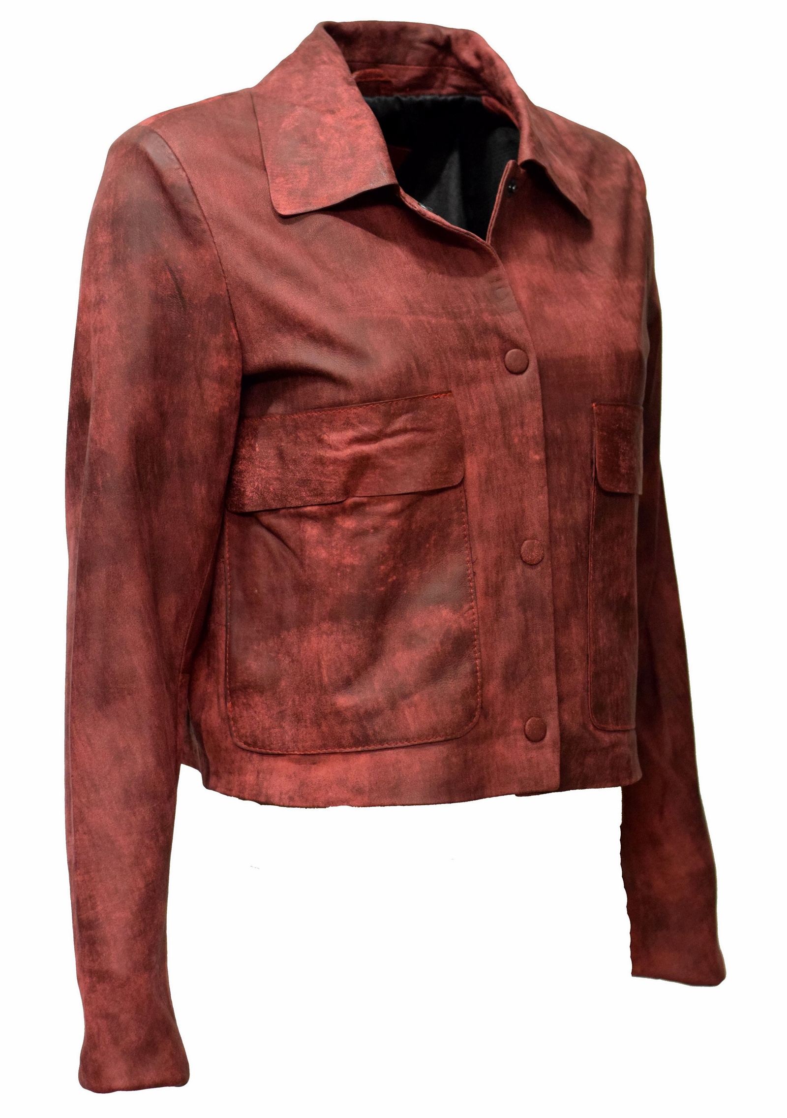 Damen Lederhemd mit aufgesetzten Brusttaschen in vintage Rot. Die Jella ist weich und ganz leicht.